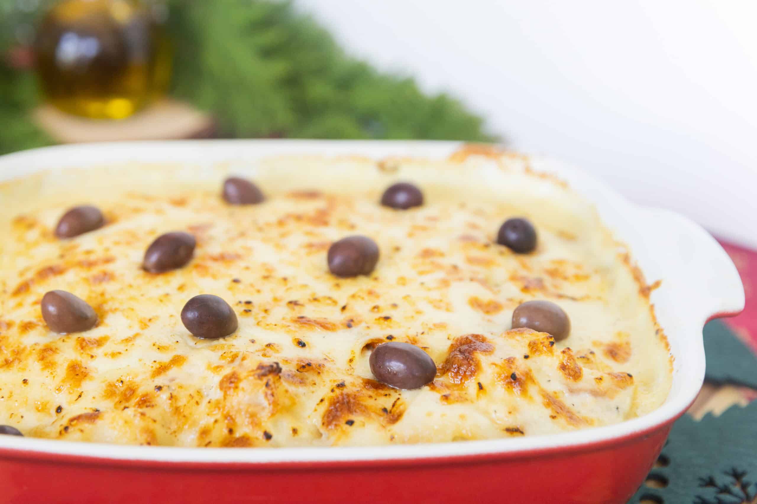 Bacalhau Gadus morhua em lascas, preparado com batatas e natas cremosas e gratinado ao forno (serve 6 porções).