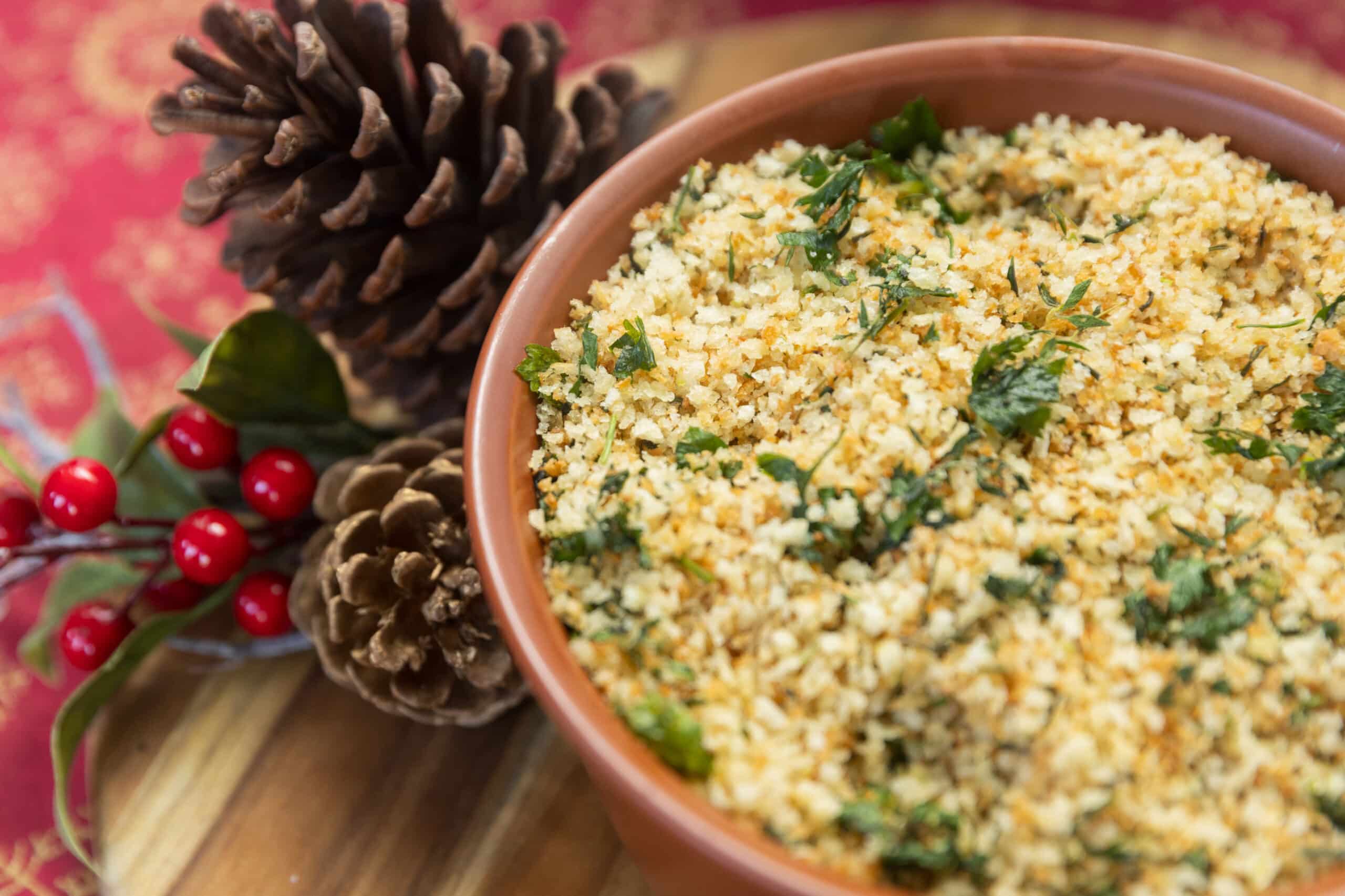 Farofa crocante, enriquecida com ervas frescas, ideal para complementar sua refeição com um toque especial.