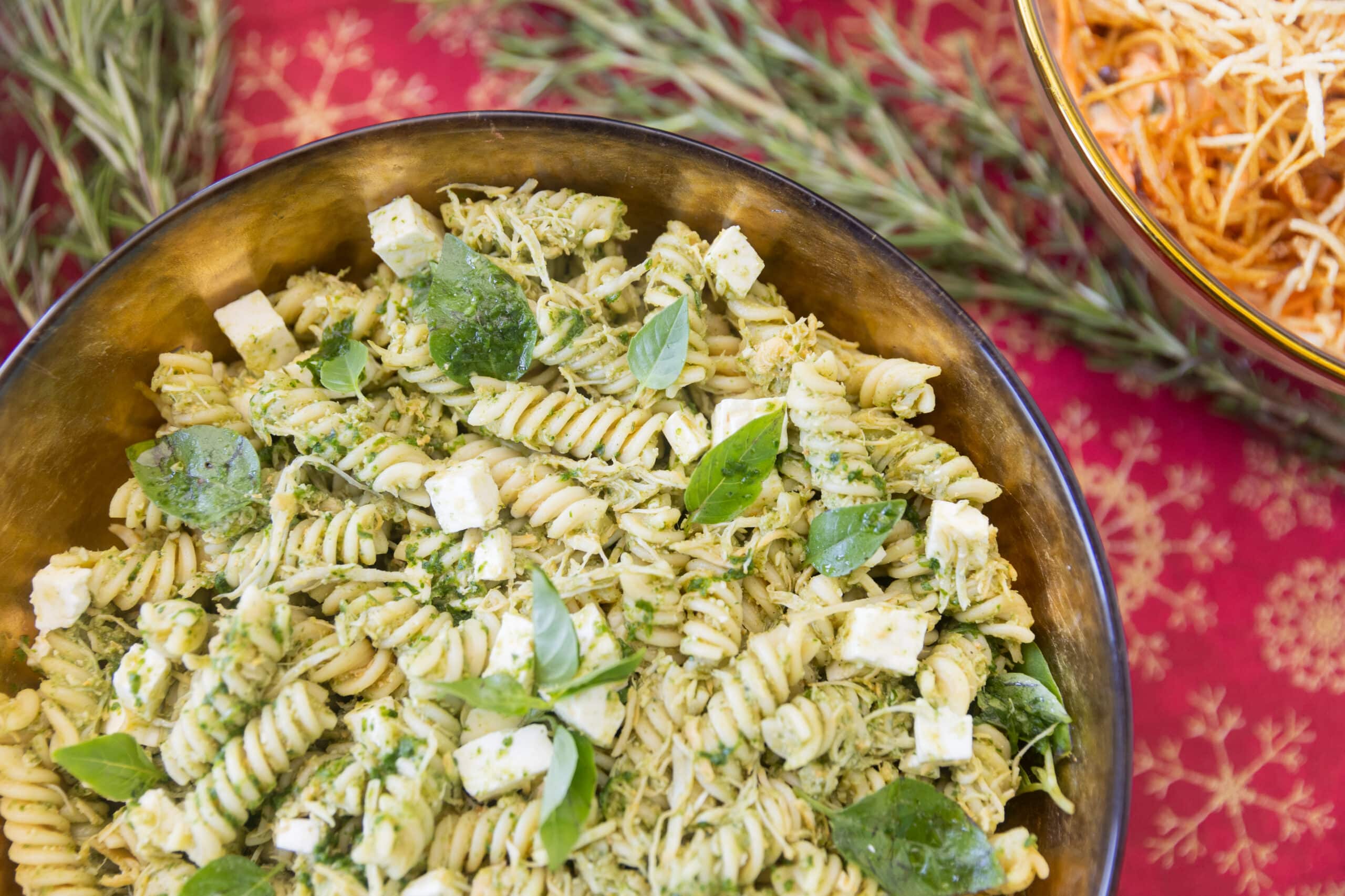 Massa fusilli com frango ao molho pesto de manjericão, combinado com folhas frescas e queijo mussarela de búfala (porção de 1kg).