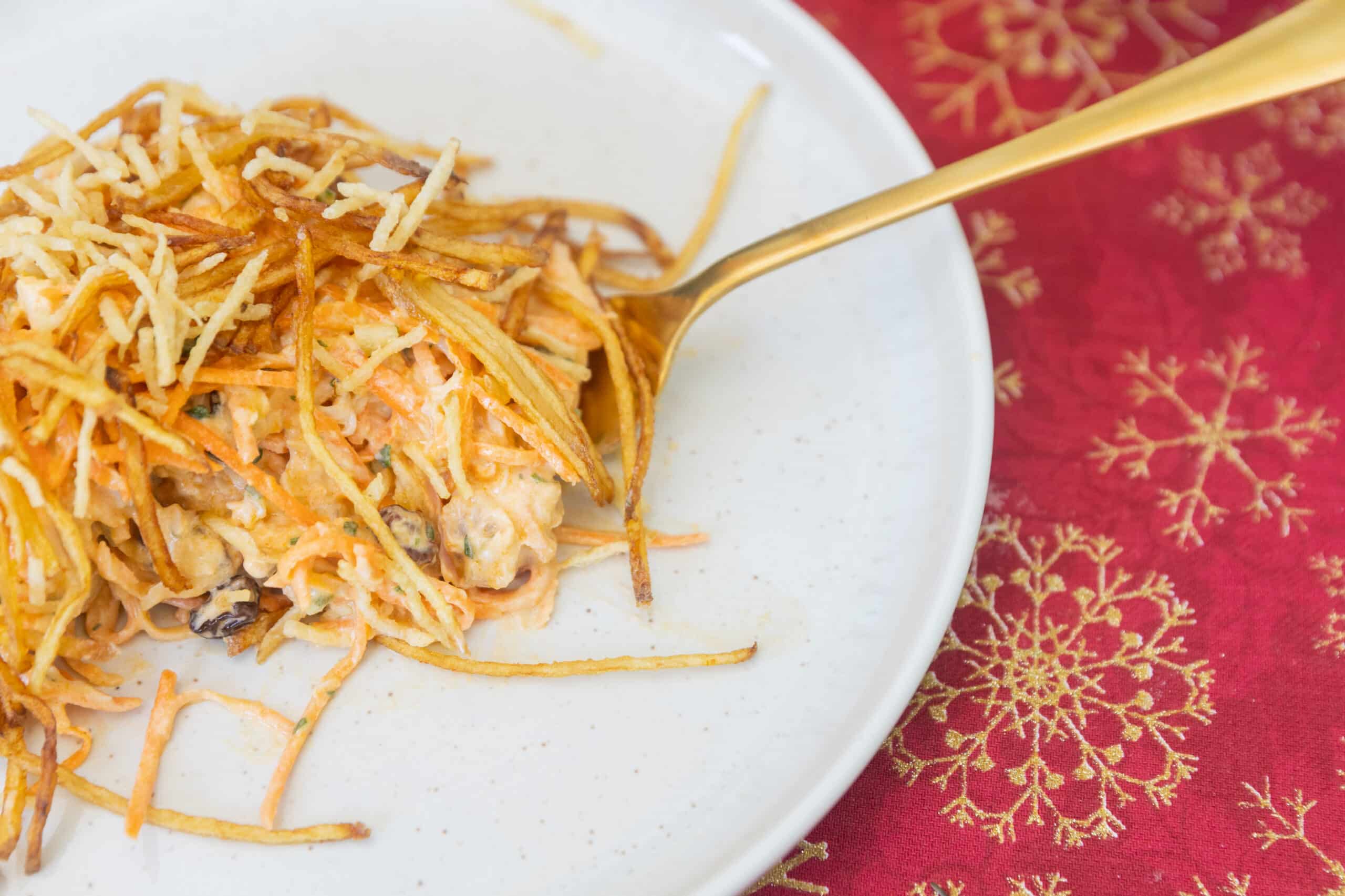 Frango defumado desfiado, cenoura, milho, ervilha, passas, molho Garden com batata palha frita (porção de 1kg)