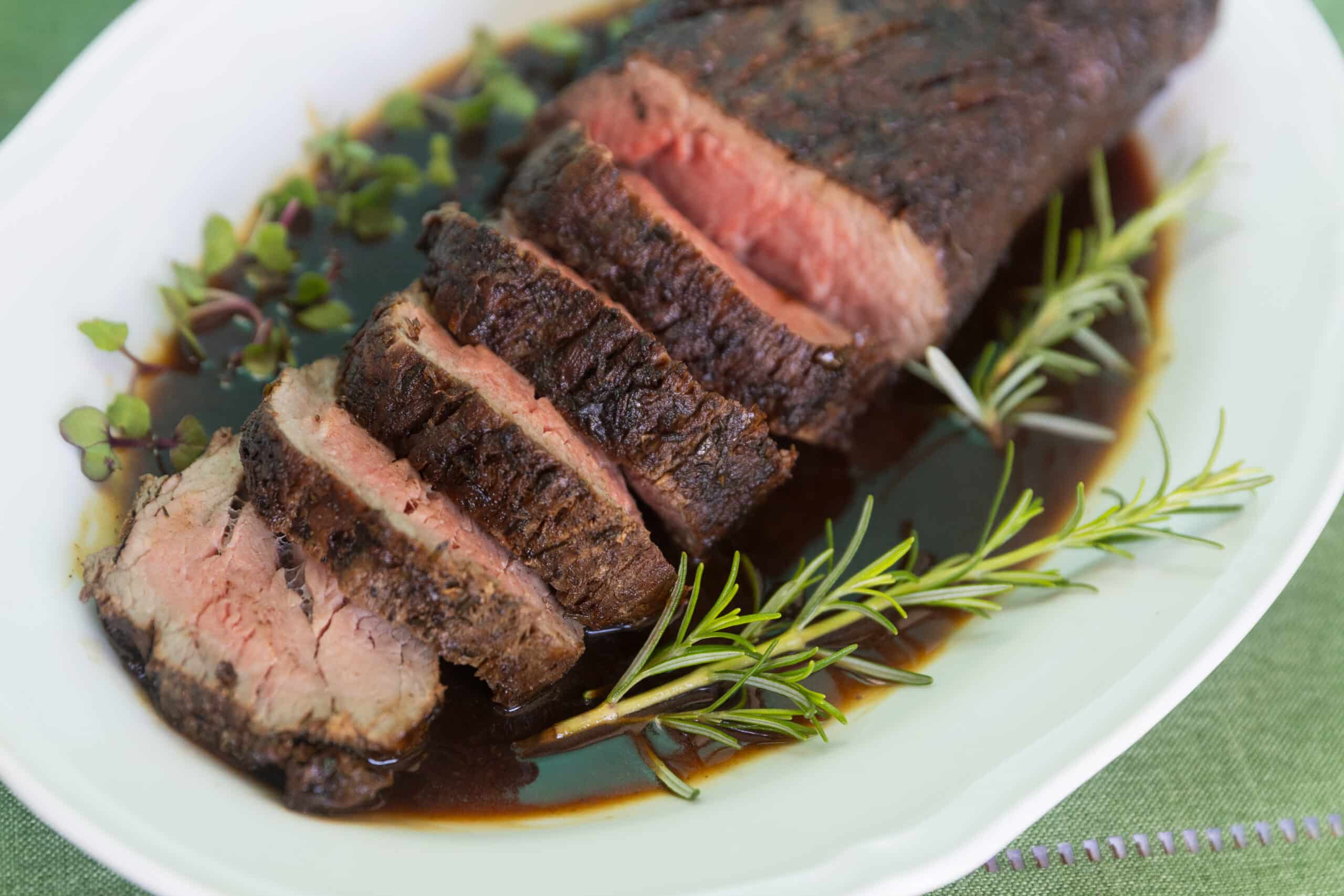 Suculento rosbife de mignon, servido com molho de mostarda ou vinho tinto, uma escolha sofisticada (serve 6 porções).